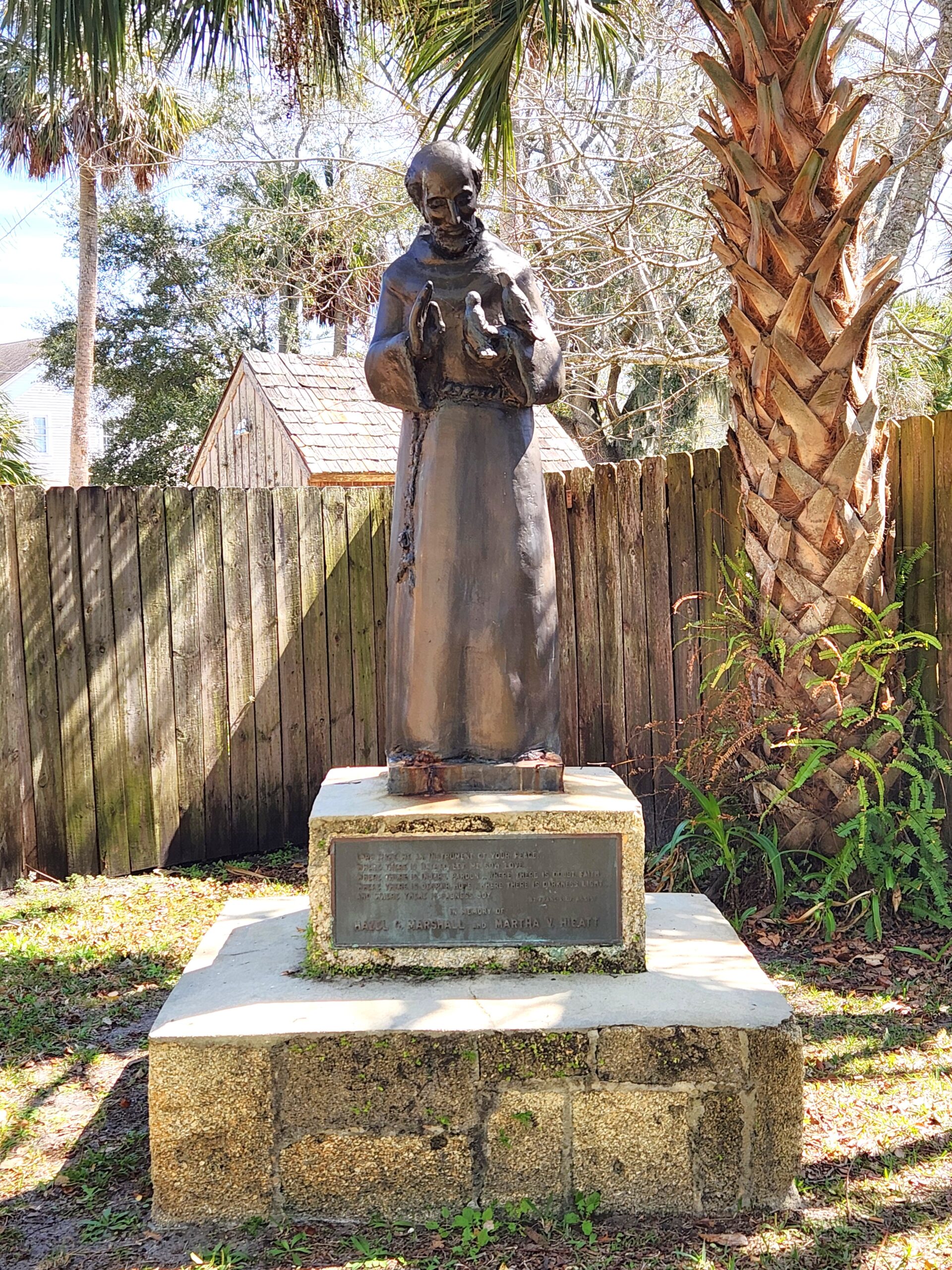 The club searched from St Louis to South America to find a statue of St Francis. They finally found the life-sized statue of St Francis that stands in the park today. The statue was designed and made by Rick Harney who was a student of August Schmitz. The August H. Schmitz Company was a specialized firm of church decorators and interior designers active in the Chicago and Peoria areas. The statue is in memory of Hazel C. Marshall, a charter member of Altrusa St Augustine and Martha V. Hieatt, a Board member.